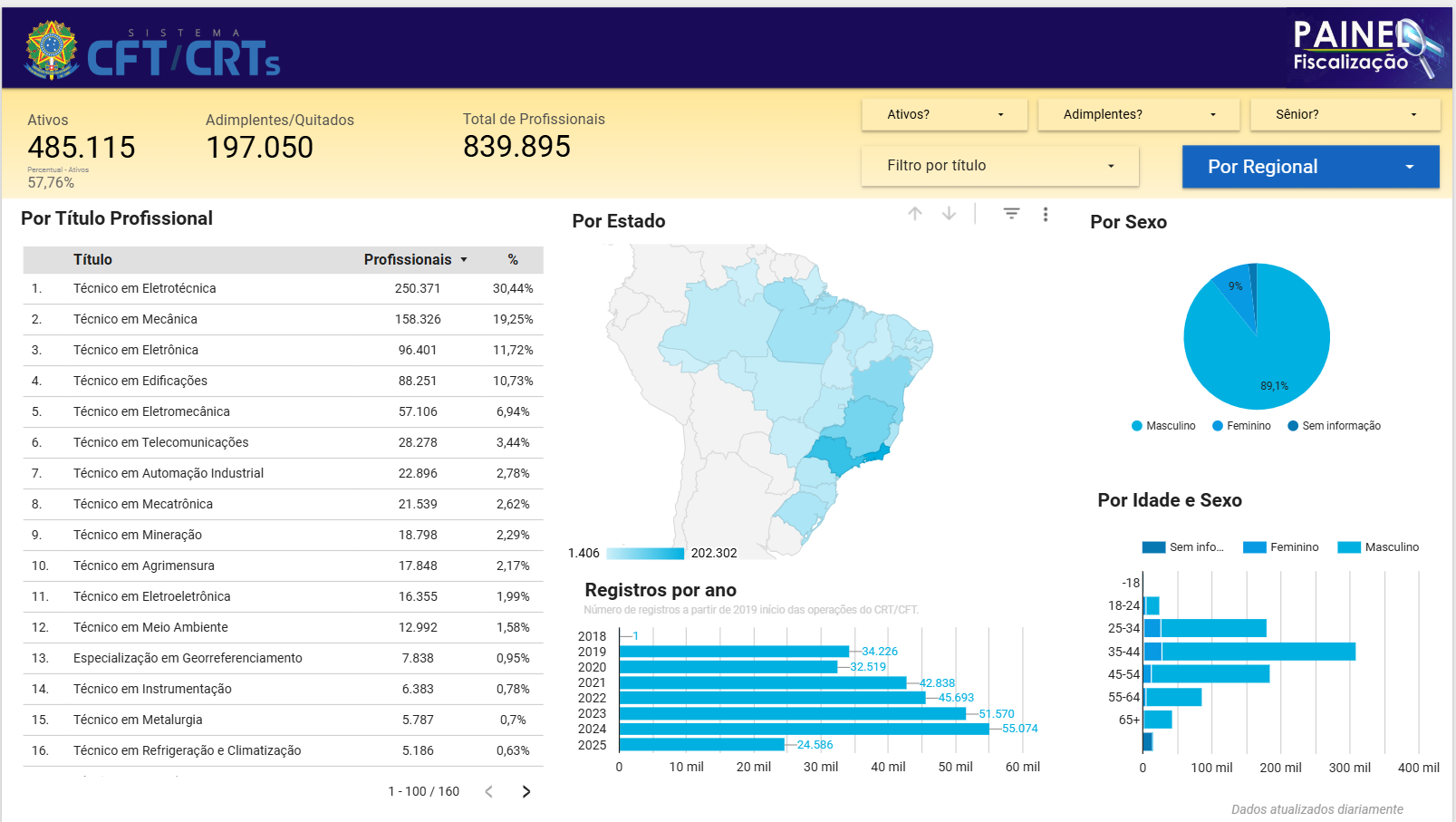 Mais de 839 mil profissionais estão registrados no conselho de classe que abrange todas as regiões do Brasil. Destes, 485 mil estão ativos e 197 mil adimplentes. Em 2024, o número de novos profissionais registrados foi superior a 55 mil. Nos primeiros cinco meses de 2025 o Sistema CFT/CRTs já registrou 24.586 novos profissionais.A diretoria executiva do CFT acredita que esses números crescentes reforçam o compromisso da Gestão 2022/2026 com o Ensino Técnico de qualidade, a valorização profissional e a proteção da sociedade.