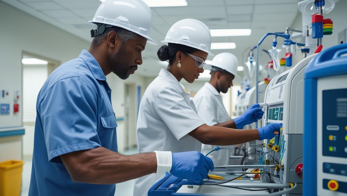 Profissionais técnicos em áreas como mecânica ou eletrotécnica são essenciais para a instalação, manutenção e monitoramento de redes de oxigênio, ar comprimido medicinal, vácuo e óxido nitroso, garantindo a pureza e a pressão adequadas para cada finalidade.
